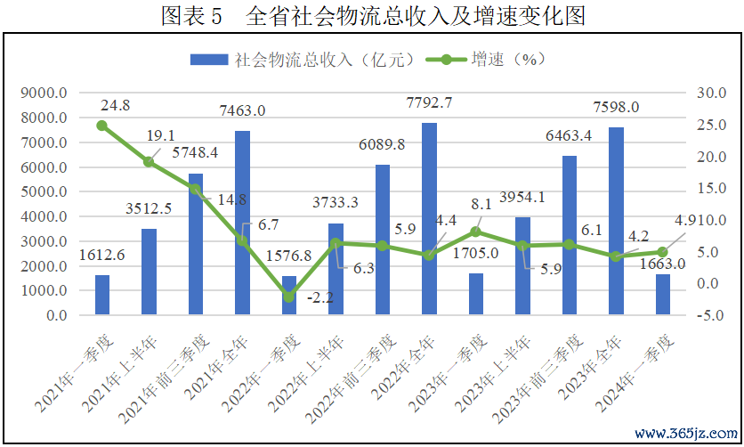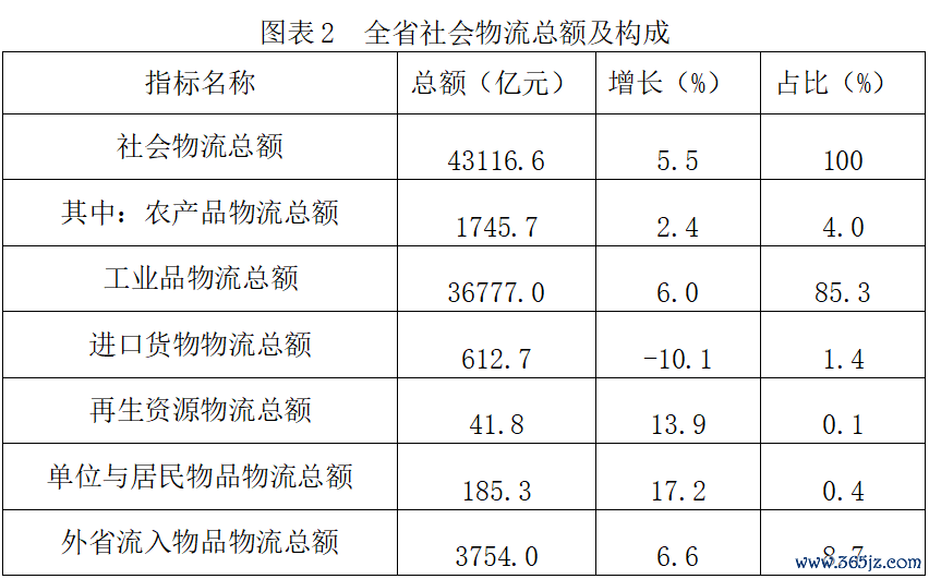 全省社会物流总收入1663.0亿元,增长4.9%。交通运输、仓储和邮政业固定资产投资增长22.8%,高于全省固定资产投资增速19.9个百分点,高于全省第三产业固定资产投资增速22.7个百分点,高于全省基础设施固定资产投资增速13.3个百分点,其中铁路运输业固定资产投资增长328.5%。全省共有A级以上物流企业338家,其中5A级物流企业15家,3A级以上企业308家。