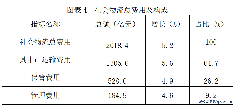 从物流各环节的费用看,运输费用1305.6亿元,增长5.6%、增速低于去年同期2.1个百分点,占总费用的64.7%、同比上升0.8个百分点;保管费用528.0亿元,增长4.9%、增速低于去年同期0.2个百分点,占总费用的26.2%、同比下降0.6个百分点;管理费用184.9亿元,增长4.6%、增速高于去年同期0.7个百分点,占总费用的9.2%、同比下降0.2个百分点。