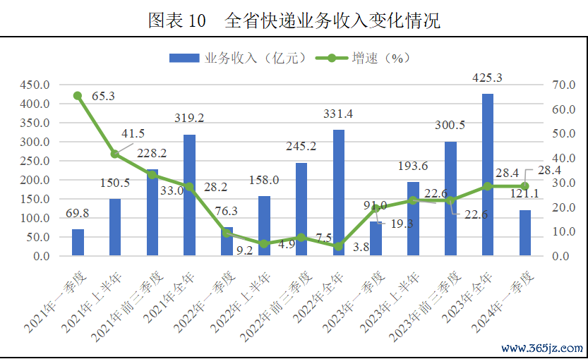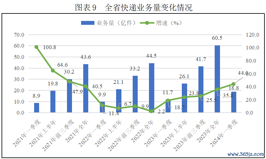 一季度,全省快递服务企业业务量累计完成18.8亿件、居全国第6位,同比增长44.0%、居全国第3位;业务收入累计完成121.1亿元、居全国7位,同比增长28.4%、居全国第4位。其中,同城快递业务量完成18243.6万件,同比增长41.0%;异地业务量完成169241.9件,同比增长44.3%;国际/港澳台业务量完成660.8万件,同比增长48.2%。