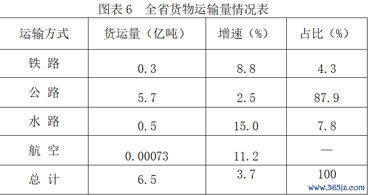 全省货物运输量6.5亿吨,增长3.7%。其中,铁路货运量增长8.8%、高于去年同期8.6个百分点;公路货运量增长2.5%、低于去年同期19.1个百分点;水运货运量增长15.0%、高于去年同期11.1个百分点;航空货运量增长11.2%,高于去年同期35.7个百分点。