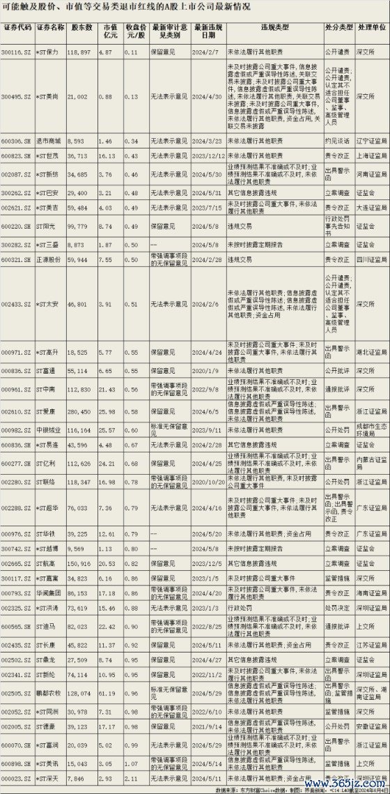 界面新闻统计发现,截至2024年6月4日收盘,已有34家A股上市公司最新收盘价跌破1元/股的“面值退市”警戒线。其中,退市商城(600306.SH)已进入退市整理期, *ST新纺(002087.SZ)将于6月6日进入退市整理期, 正源股份(600321.SH)、*ST保力(300116.SZ)、*ST世茂(600823.SH)、 ST中南(000961.SZ)等公司则已经明确收到交易所终止上市通知。