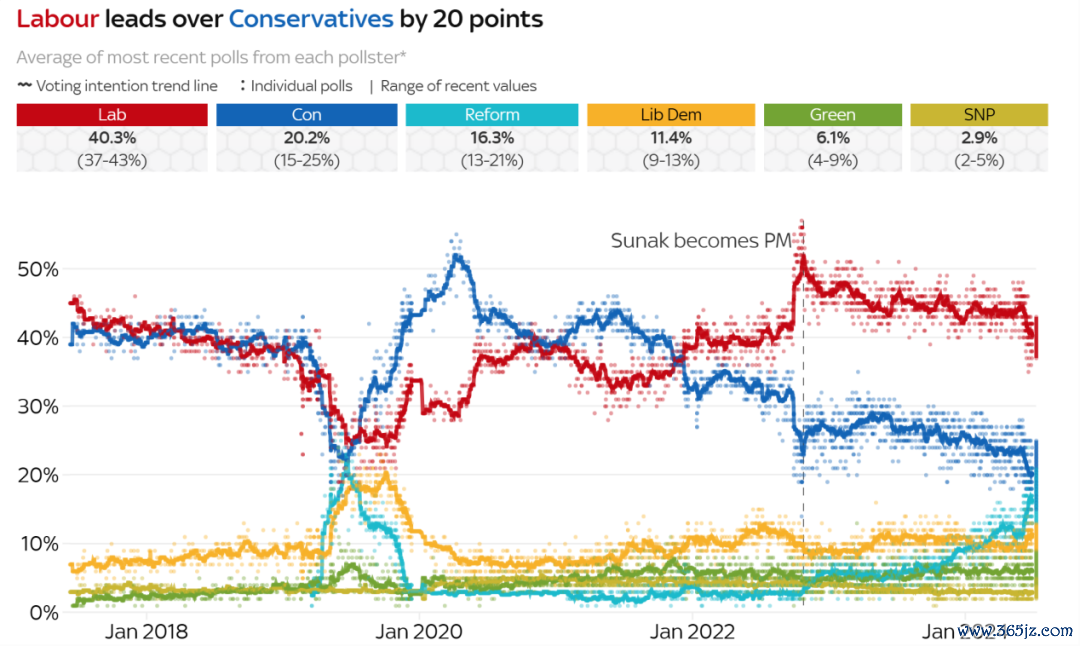 记者查询英国天空电视台民调发现,工党目前的支持率为40.3%,领先保守党20个百分点。