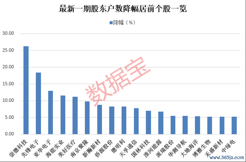 股东户数降幅最多的是崇德科技,最新股东户数为7000户,较6月20日下降26.32%;筹码集中以来该股累计下跌8.17%。