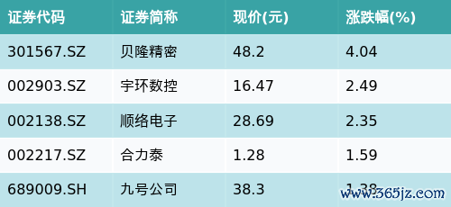 截至收盘网上配资炒股公司,小米概念主题涨跌幅最高的五只股票为:贝隆精密(301567.SZ)、宇环数控(002903.SZ)、顺络电子(002138.SZ)、合力泰(002217.SZ)与九号公司(689009.SH)。详情见下表: