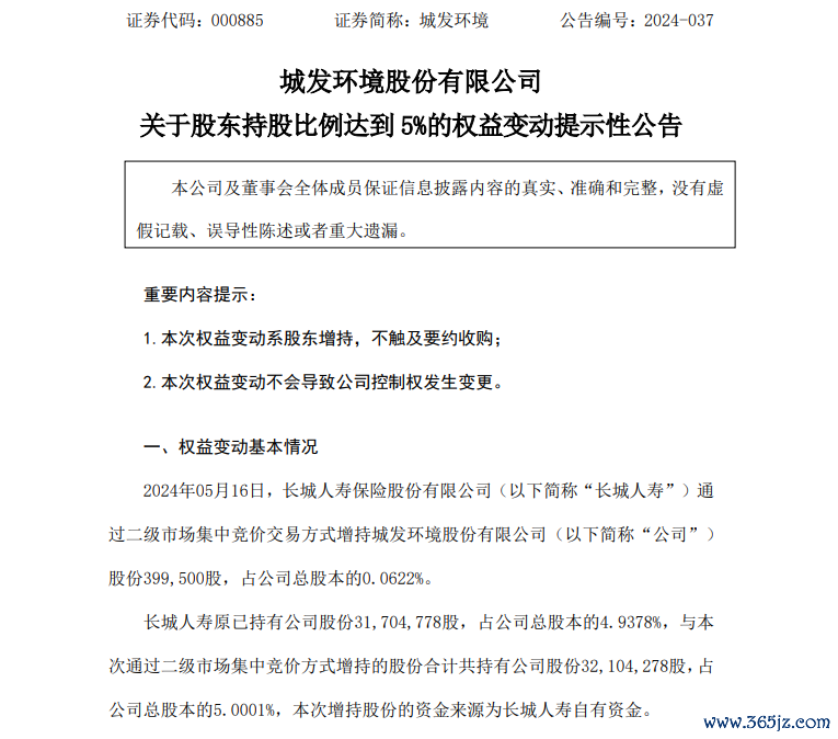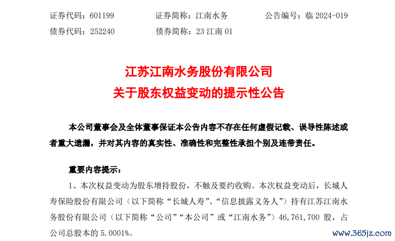 据江南水务公告,公司5月17日收到长城人寿出具的《简式权益变动报告书》,截至公告日,长城人寿累计通过二级市场增持公司股份4676.17万股,占公司总股本的5.0001%。在本次权益变动前,长城人寿持有江南水务4642.57万股股份,占公司总股本的4.9642%。