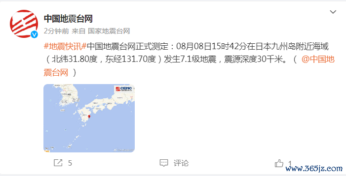 据央视新闻,中国地震台网正式测定:8月8日15时42分,在日本九州岛附近海域(北纬31.8度,东经131.7度)发生7.1级地震,震源深度30公里。