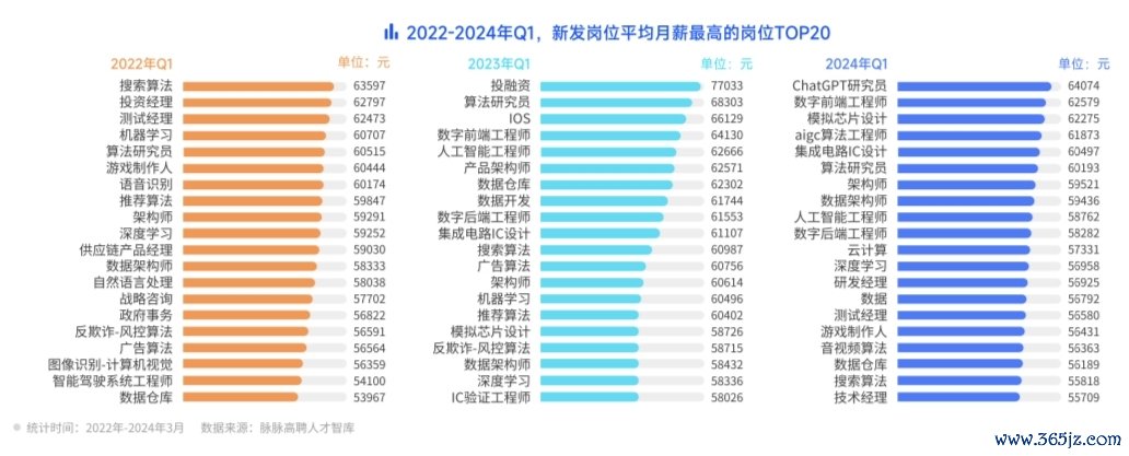 从不同行业的新发岗位平均月薪来看,智能硬件薪酬连续两年领跑,纯互联网回升跻身前三名。高薪岗位方面,ChatGPT研究员以平均月薪64074元位居榜首,紧随其后的是数字前端工程师62579元和模拟芯片设计62275元。