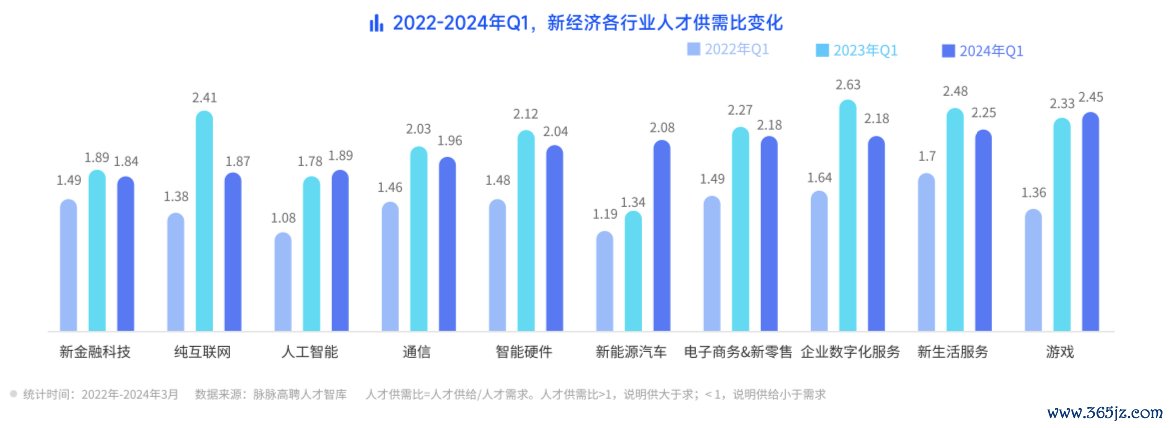 近日,脉脉高聘发布《2024春招高薪职业和人才洞察》显示,2024年第一季度,新经济行业人才供需比为1.94,相比2023年第一季度的2.05略有降低。这意味着,虽然人才求职竞争依然激烈,但人才求职压力相较于去年同期有所减轻。
