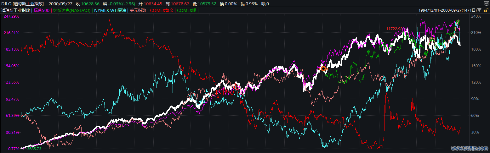 降息期间美股及商品走势(白线-道指,紫线-标普500指数,绿线-纳指,蓝线-原油,粉线-美元指数,红线-COMEX黄金,绿线-COMEX铜) 图片来源:Wind