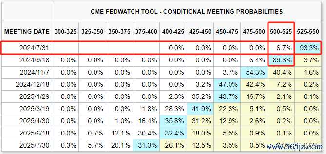这是美国CPI连续第三次低于华尔街预期,3个月和6个月的年化通胀率也均出现下降。数据发布后,利率互换合约显示,期货市场开始大幅押注美联储FOMC9月份会议降息的概率,甚至开始对7月底的会议进行计价,不过目前来看本月底降息的概率还不到10%。