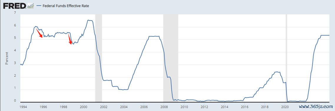 1995年一直作为美联储“未雨绸缪”的预防式降息模板,暂停加息后5个月降息。虽然墨西哥金融危机导致美国经济有走弱的迹象,但仍保持在健康增长区间,增加了美联储的政策空间。美联储抓住机会,在经济尚未萌芽明显放缓之际,预防式降息,最后成功实现软着陆。