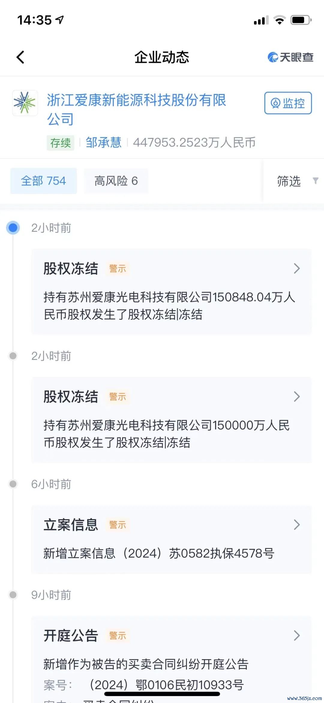 根据天眼查显示,6月14日、18日、20日,杭州、赣州两地的法院,将ST爱康、相关子公司及实控人邹承慧,列入被执行人,执行标的为1.02亿元—3.51亿元。