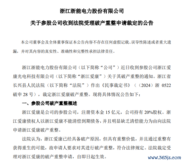 7月26日公告显示,浙能电力(600023)近日收到参股公司浙江爱康光电科技有限公司(下称“浙江爱康”)关于其破产重整的通知。