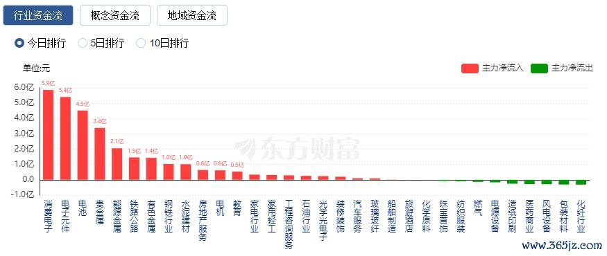 行业资金方面,截至收盘,消费电子、电子元件、电池等净流入排名靠前,其中消费电子净流入5.86亿。