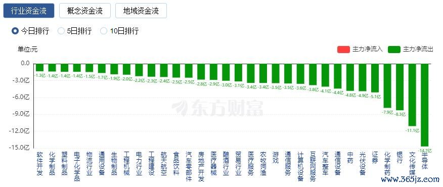净流出方面,半导体、文化传媒、银行等净流出排名靠前,其中半导体净流出14.71亿元。