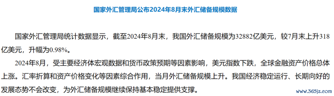 国家外汇管理局统计数据显示,截至2024年8月末,我国外汇储备规模为32882亿美元,较7月末上升318亿美元,升幅为0.98%。