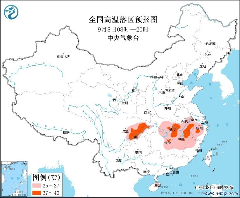 未来一周,南方地区持续高温天气,强度有所减弱。中央气象台9月8日06时继续发布高温黄色预警,预计9月8日白天,安徽中南部、湖北中东部、湖南中东部、江西大部、浙江大部、福建西北部、四川盆地中东部、重庆大部等地有35~36℃高温天气,其中,安徽南部、湖北东部、湖南东部、江西北部、浙江中部、四川盆地东部、重庆中西部等地部分地区最高气温37~39℃。