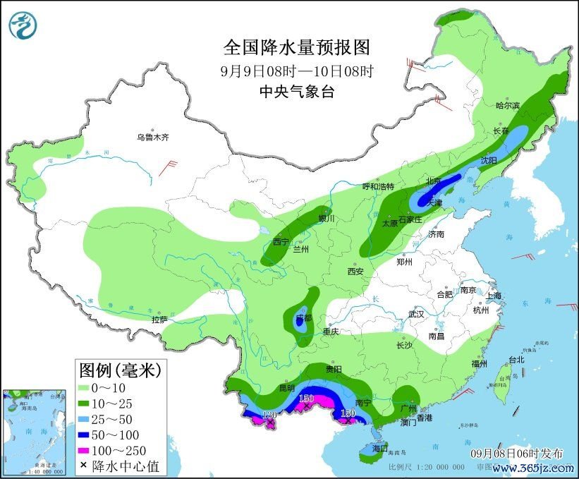 9月9日08时至10日08时,东北地区东部、青海东部、华北大部、四川盆地西部、西南地区南部、华南西部等地部分地区有中到大雨,其中,河北中部和东北部、天津、云南南部、广西西部和南部等地部分地区有暴雨或大暴雨(100~150毫米)。内蒙古东北部和中部、新疆南疆盆地等地部分地区有4~6级风。