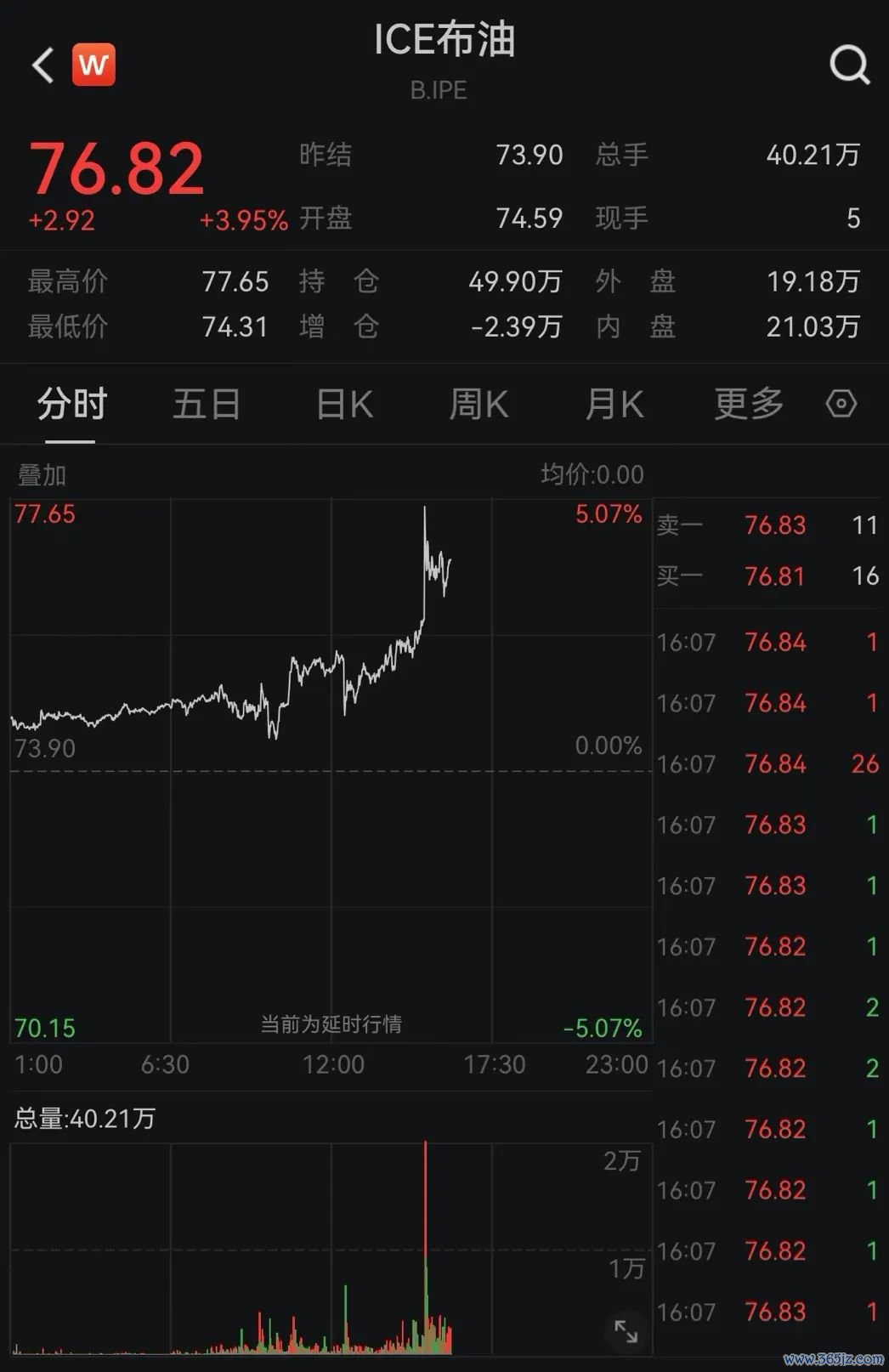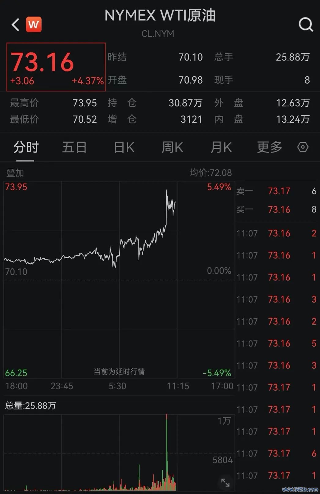 当地时间10月3日,国际油价大涨。WTI原油期货一度涨超5.49%,刷新日高至73.95美元/桶;布伦特原油期货一度涨5.07%股票网络配资,报77.65美元/桶。截至记者发稿,涨幅有所收窄,WTI原油期货涨4.37%,报73.16美元/桶;布伦特原油期货涨3.95%,报76.82美元/桶。