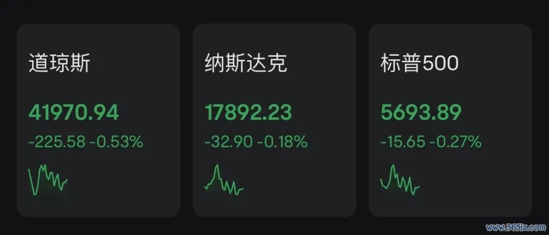 当地时间周四,美股三大指数悉数低开,道指跌0.3%,纳斯达克指数跌0.39%,标普500指数跌0.24%。截至记者发稿,三大指数延续跌势,道指跌0.53%,纳斯达克指数跌0.18%,标普500指数跌0.27%。